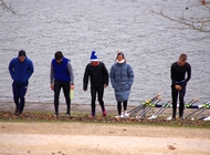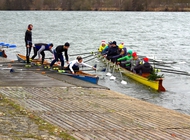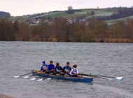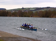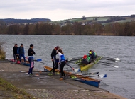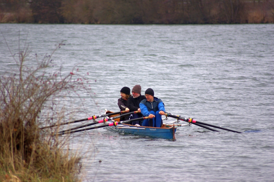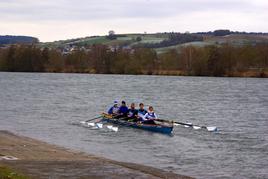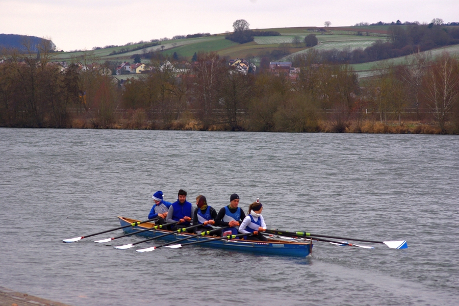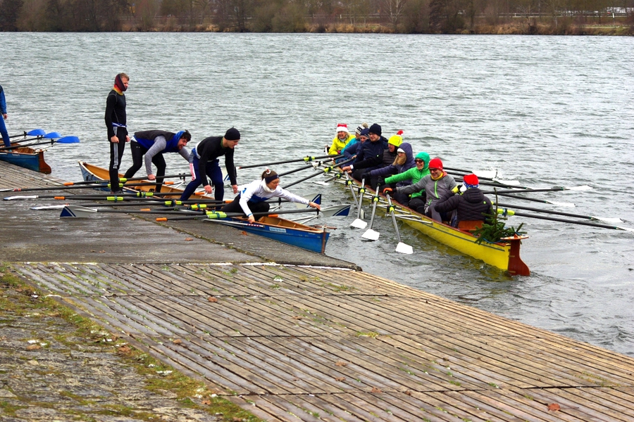 Trotz einer Außentemperatur von gerade einmal 0,5° C haben sich auch an diesem 24. Dezember um 12 Uhr 17 Mitglieder des RRK zum traditionellen Weihnachtsrudern am Bootshaus eingefunden. Die teils weihnachtlich geschmückten Ruderer und Ruderinnen aller Altersklassen verteilten sich auf drei Boote: einen Dreier, einen Fünfer und den gelben Achter, den sie mit einem kleinen Weihnachtsbäumchen dekorierten.