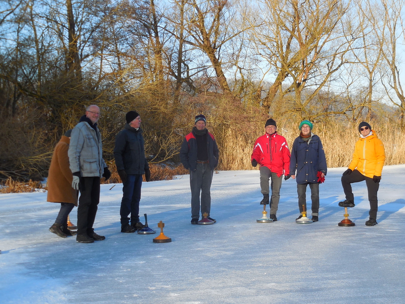 Als Klub-Chef Hans von Ortskundigen erfahren hat, daß die Rinsen zugefroren ist und das Eis trägt, hat er sofort per Rundbrief zu einem Wochenende auf dem Eis eingeladen, worauf man sich entschloß, nicht nur den Montag, sondern womöglich auch noch den Mittwoch dranzuhängen. Wer weiß, wann es die nächste Gelegenheit – bei schönem Wetter – geben wird.