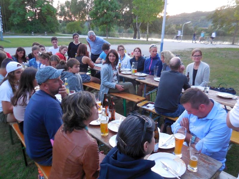 Ein Besuch im Westbad hat am Donnerstag unsere Gäste über die entgangene Fahrt durch den Donaudurchbruch hinweggetröstet. Den Freitag hatten sie dann zur freien Verfügung, um sich noch einmal in der Stadt umzuschauen oder nach Souvenirs zu suchen. Zum Abschied fand am Abend eine Grillparty vor dem Bootshaus statt, die Sebastian Ritter, der sich schon die ganze Woche unermüdlich um die Truppe gekümmert hatte, beinahe im Alleingang bewältigte. Freilich halfen ihm die Gäste und die Jugendlichen, die nun als erste zum Gegenbesuch nach Tui starten dürfen.