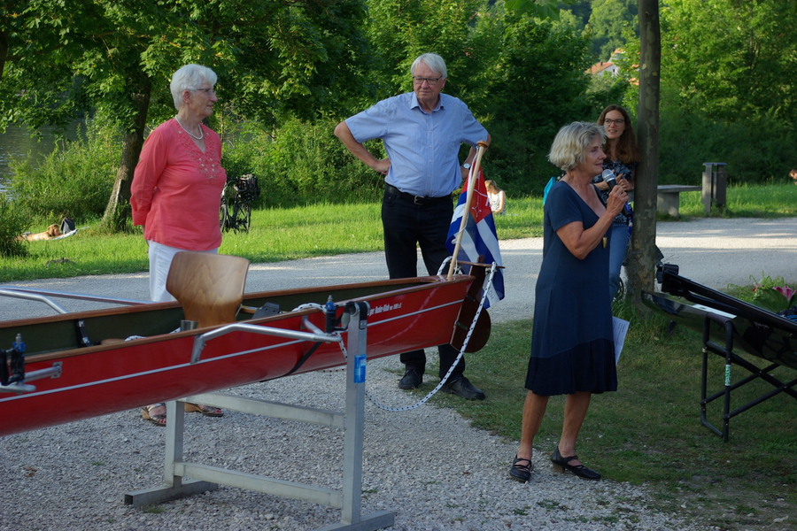 Da inzwischen wider Erwarten doch dunkle Wolken aufgezogen waren, mußte der nächste Programmpunkt: die Verleihung der Fahrtenabzeichen und die Verabschiedung von Louisa Mössinger, die im Rahmen ihres FSJ im Klub tätig war, vorgezogen werden. Herausragend unter den 37 Erwerber*innen des Fahrtenabzeichens sind Helga Naber (45 x) und Ute Duchardt (30 x). Hans Thumann (35 x) erhielt zudem den begehrten Äquatorpreis für eine Gesamt-Ruderleistung von 40.077 km.