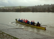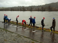 Zur geplanten Startzeit um 12:30 Uhr war es noch ziemlich ruhig am Bootshaus, aber so nach und nach trafen doch etliche Unentwegte ein, so daß es für fünf Boote (darunter ein Achter) reichte. Allerdings spielte das Wetter zunächst nicht mit. Just zu dem Zeitpunkt, wo man die Boote nach außen trug, um sie mit Weihnachtsbäumchen zu versehen, begann es zu regnen, erst leicht, dann heftiger, dann wieder nachlassend. Erst als das letzte Boot im Wasser war und Petrus einsah, daß sich diese Ruderer nicht würden abhalten lassen, die Tradition des Weihnachtsruderns aufrechtzuerhalten, stellte er den Regen ab und bald darauf ließ sich sogar die Sonne wieder sehen. Freilich blieb es bei 4° C und einem munteren Lüftchen, aber ist man erst einmal in Bewegung, dann spielt die Temperatur keine große Rolle mehr, so daß die fünf Boote sogar über die übliche Hausstrecke von 10 km hinausfuhren, ehe sie zu einem Ausklang bei Glühwein ins Bootshaus zrückkehrten.