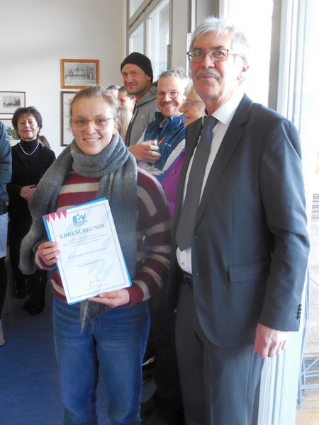Stellvertretend für den Bayerischen Ruderverband /BRV/ fand quasi als Höhepunkt der Veranstaltung die Ehrung der Leistungssportlerin Ingeborg Christl statt, der Hans für ihre Siege /Gold und Bronze/ bei den Deutschen Meisterschaften U17/U19/U23 in Köln die Verdienstnadel mit silbernen Riemen des BRV überreichen sollte, die aber vom BRV derzeit nicht geliefert werden konnte, so daß es vorerst bei der Überreichung der dazugehörigen Urkunde blieb, was den Applaus der Anwesenden aber nicht schmälern konnte.