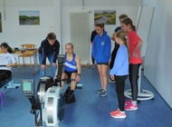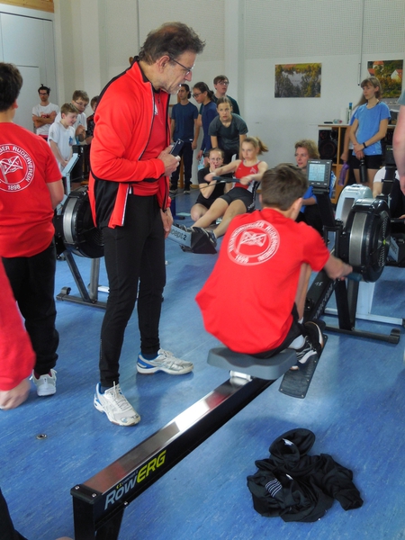 Dazu waren zehn Ergometer im Aufenthaltsraum des Bootshauses des RRK face-to-face aufgestellt. Raban Schürmann, dem Trainer des RRK, standen zwei Lehrkräfte (Thomas Schweigert, BiMaMü; Daniela Schmeiduch, AMG) und Rosa Büchele sowie die Trainingsmannschaft des RRK bei der Organisation und Durchführung zur Seite.