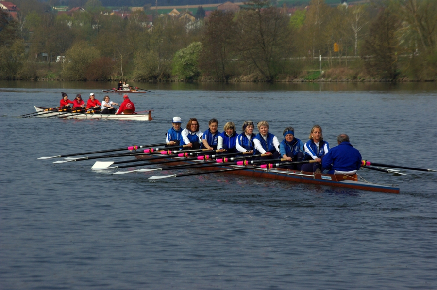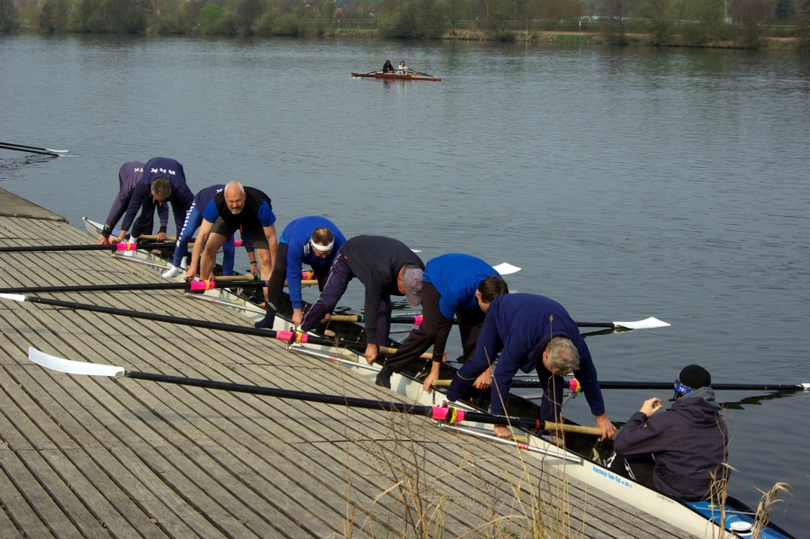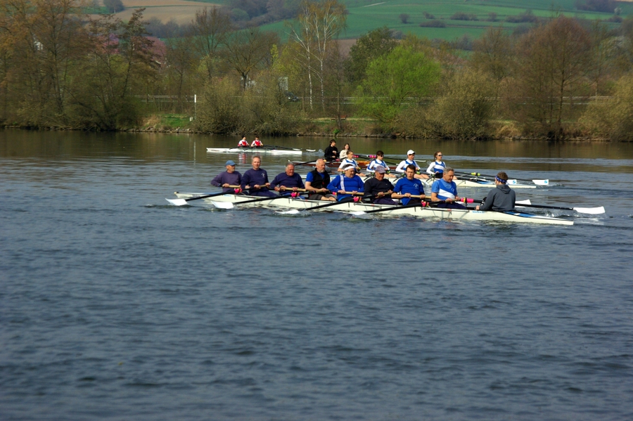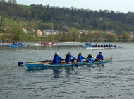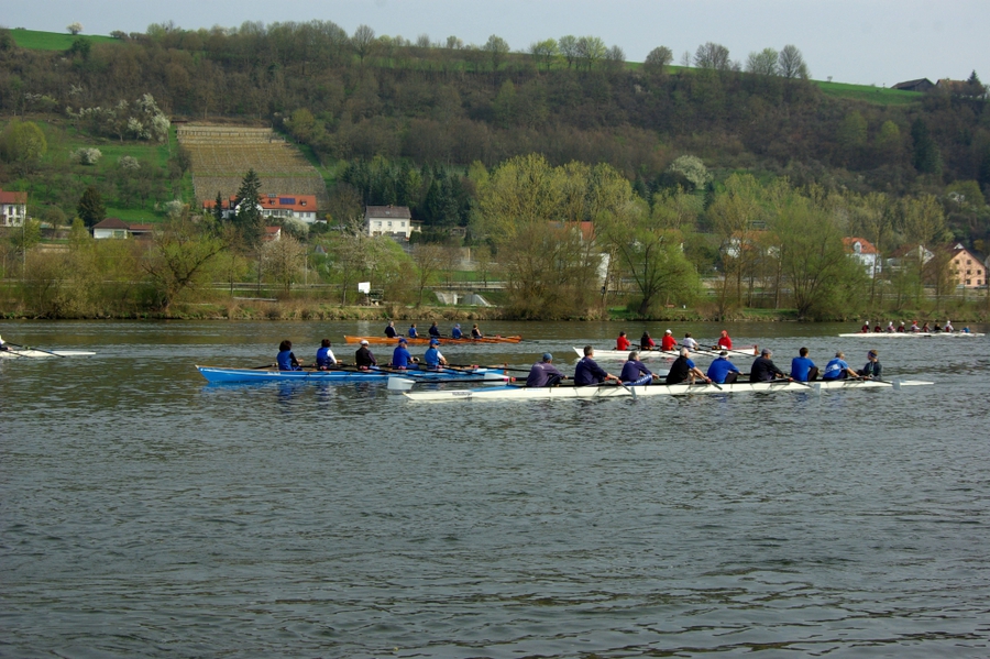 Fast 30 Boote beteiligten sich am traditionellen Anrudern, wobei die Zahl der teilnehmenden Boote dadurch verringert wurde, daß dieses Mal fünf Achter (drei vom RRK und zwei vom RRV) am Start waren, deren insgesamt 45 Mann Besatzung sonst auf mehrere kleinere Boote hätten verteilt werden müssen.