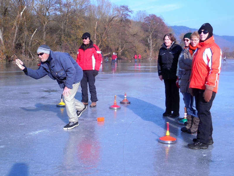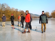 Am 28. März war es wieder einmal so weit, daß man dem Eis trauen konnte und so fanden sich an diesem Tag, den beiden folgenden Tagen und am Sonntagvormittag (4.3.) jeweils zehn bis zwölf wetterfeste RRKler in Sarching ein, wo auf spiegelglattem jeweils drei bis dreieinhalb Stunden gespielt wurde. Auch am Samstag hätte man gut spielen können, doch das verbot sich, denn da war Frühjahrsputz im Bootshaus angesagt.Am Sonntagmittag endete das Eisstockschießen in Form einer Seeschlacht, weil die kräftige Frühjahrssonne die obere Eisschicht abtaute, so daß man zentimetertief im Wasser stand. Aber wann hat man das schon: Eisstockschießen mit Aquaplaning?