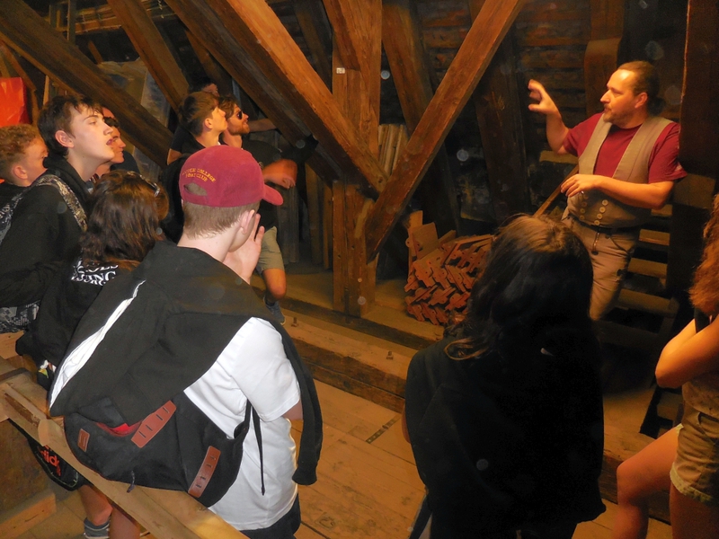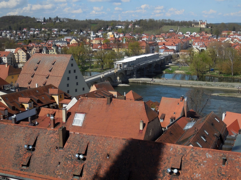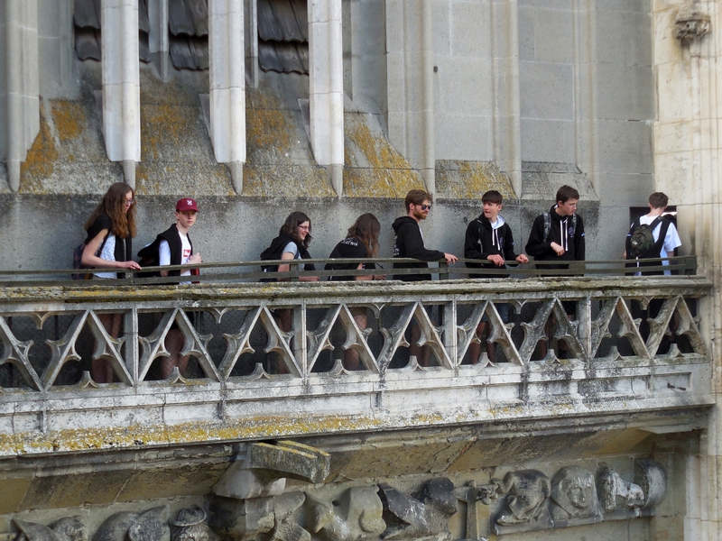 After the guided tour of the city on Saturday after the reception in the townhall, our Scottish guests were up for another treat on Wednesday. We had arranged for them a visit of the "Dombauhütte" or cathedral workshop in charge of the maintainance of the cathedral. In the workshop, they learned about the craft of the stonemason that has not changed significantly since the Middle Ages. Then, in two groups, one guided by stonemason Baumüller, one by Christian Brunner, they were allowed to climb up into the towers of the cathedral, reaching first the top of the vault from which they could look down 32 m into the nave of the church, before proceding to the bridge between the two spires (56 m above ground . . . but still 43 m from the very top) from which they had an excellent view of the city and the surrounding landscape.
