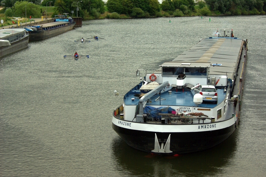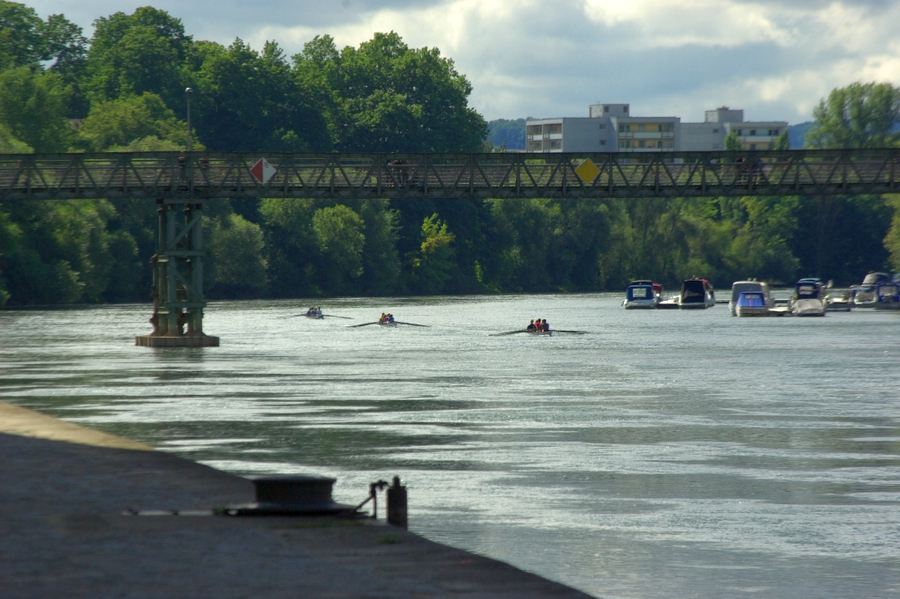 Nachdem unsere spanischen Gäste gestern unser Ruderrevier bei einer Naabfahrt in nordwestlicher Richtung hatten kennenlernen können, stand am zweiten Rudertag die Stadtrundfahrt mit der Durchquerung der Steinernen Brücke auf dem Programm. Wieder wurde der Start durch Regen verzögert, aber dann konnte die Fahrt bei Sonnenschein absolviert werden. Auf drei C-Boote verteilt, ging es durch die Bootsgasse am Pfaffensteiner Wehr, vorbei an der Kulisse der Altstadt bis zur Einmündung des RMD-Kanals, dann hinauf in die Regen-Mündung und durch die Großschifffahrtsschleuse zurück zum Bootshaus - für alle Teilnehmer eine erlebnisreiche Fahrt. Wegen der verspäteten Abfahrt und einer langen Wartezeit vor der Schleuse, schafften es die Gäste gerade noch rechtzeitig, zum Beginn des Sommerfests des RRK das Bootshaus zu erreichen.