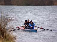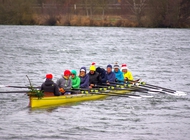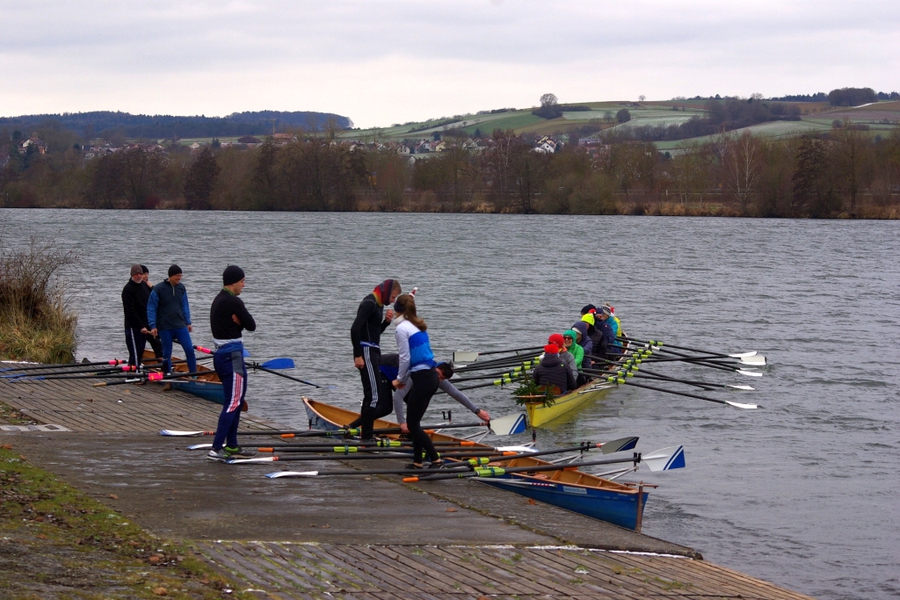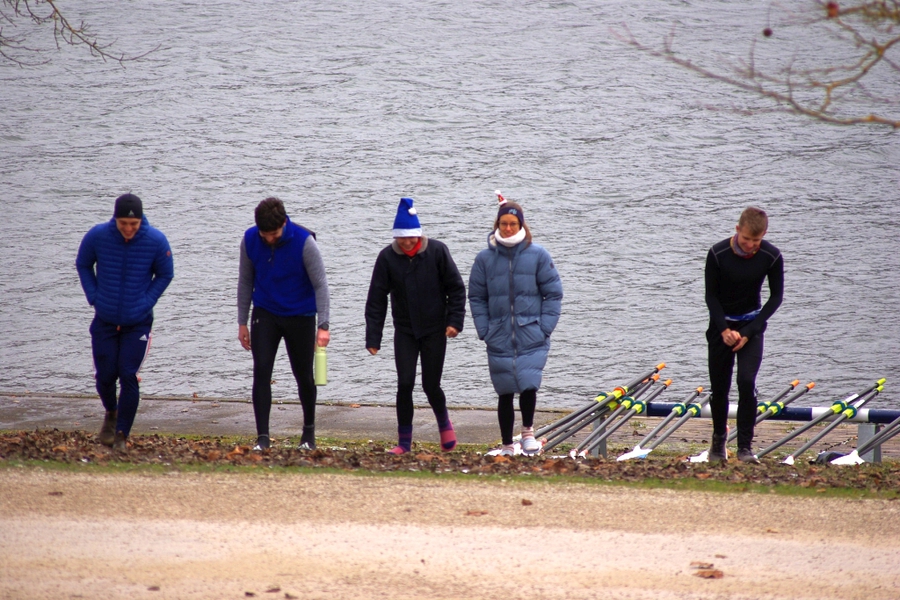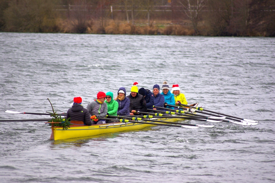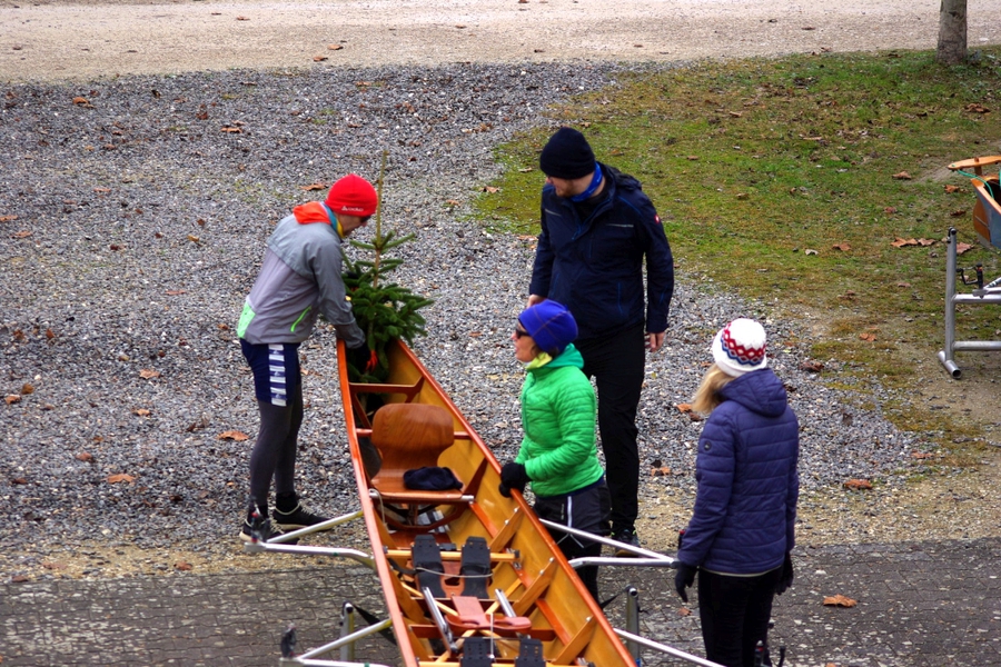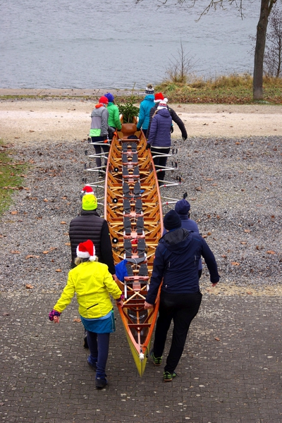 Trotz einer Außentemperatur von gerade einmal 0,5° C haben sich auch an diesem 24. Dezember um 12 Uhr 17 Mitglieder des RRK zum traditionellen Weihnachtsrudern am Bootshaus eingefunden. Die teils weihnachtlich geschmückten Ruderer und Ruderinnen aller Altersklassen verteilten sich auf drei Boote: einen Dreier, einen Fünfer und den gelben Achter, den sie mit einem kleinen Weihnachtsbäumchen dekorierten.